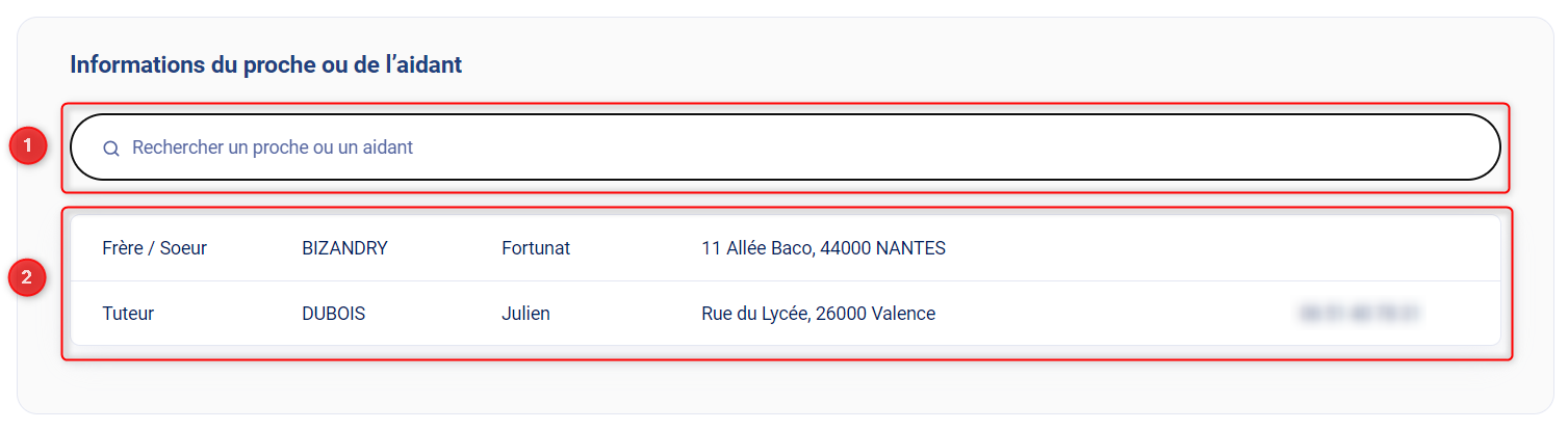 Effectuez une recherche dans le champ de recherche de la zone 1, en saisissant le nom et prénom de l'aidant.