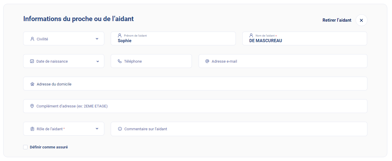 Si l'aidant n'est pas l'assuré principal, seuls les champs "Nom" et le "Rôle de l'aidant" sont requis. Cependant, si l'aidant est l'assuré principal, des informations supplémentaires deviennent obligatoires et sont signalées par un astérisque rouge (*).
