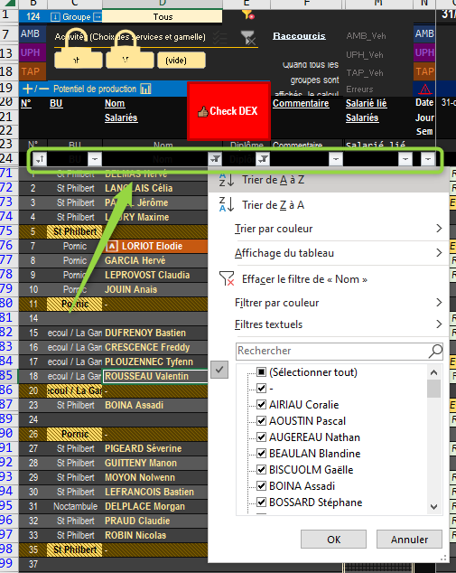 Il est possible de trier de différentes manières (par ordre alphabétique, par diplôme, par site) les salariés présents dans l'onglet Planning. Pour cela, il suffit d'utiliser les boutons filtres de la ligne 24 :