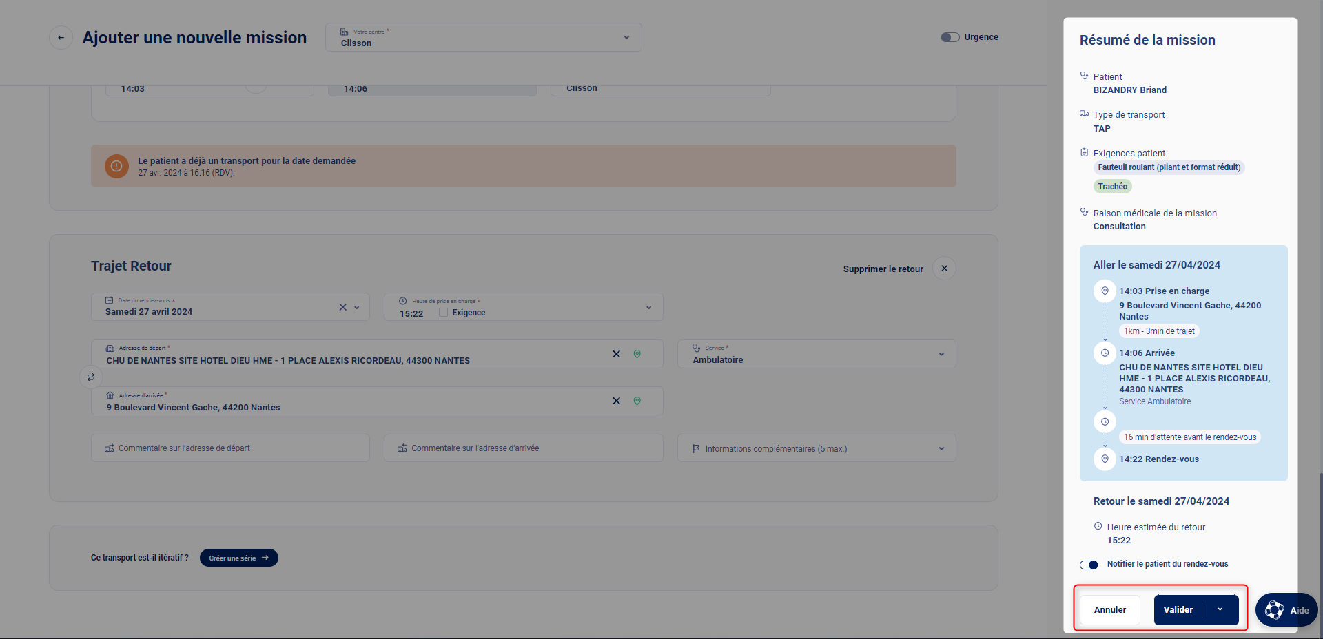 Vérifiez le résumé dans le bandeau à droite, puis confirmez pour enregister la mission.
