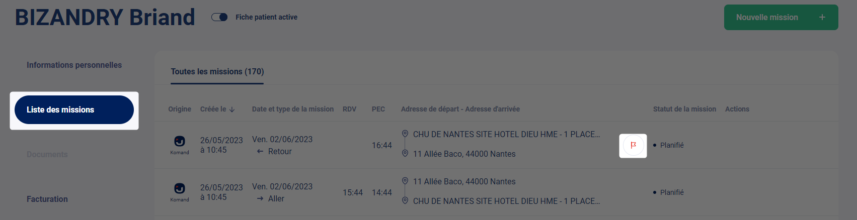 Vous pouvez déclarer un retour lorsque le trajet d'une mission contient un marqueur "Attente retour", dans l'onglet "Liste des missions" de l'annuaire patient cela se traduit par l'icône suivant :