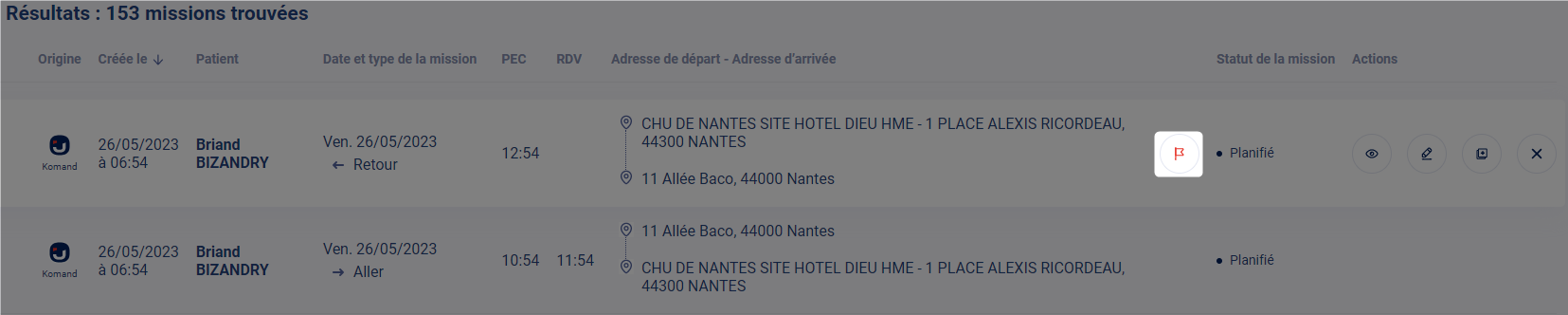 Vous pouvez déclarer un retour lorsque le trajet d'une mission contient un marqueur "Attente retour", dans le planning des missions cela se traduit par l'icône suivant :