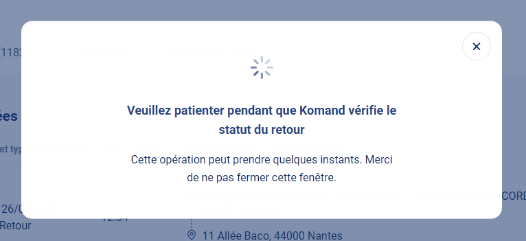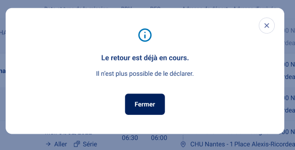 Et comme la modale l'indique, vous ne pouvez pas déclarer le retour car la mission a déjà débuté.