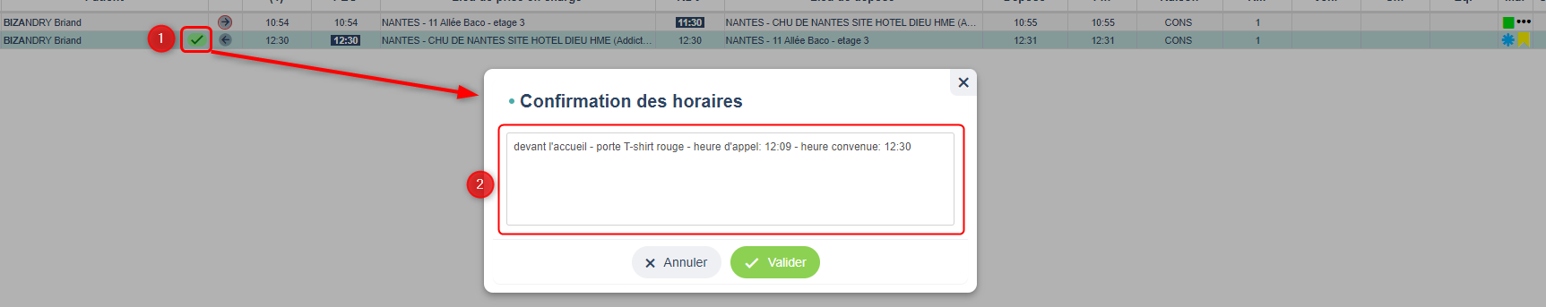 1. Le pictogramme vert indique que le retour a été déclaré. Lorsque vous cliquez sur le pictogramme, une fenêtre "Confirmation des horaires" s'affiche.