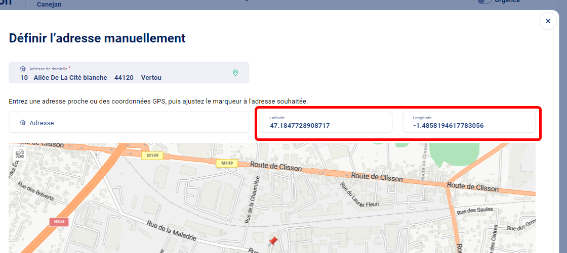 Sélectionnez cette adresse proche de l'adresse du patient afin de faire bouger la carte vers celle-ci.