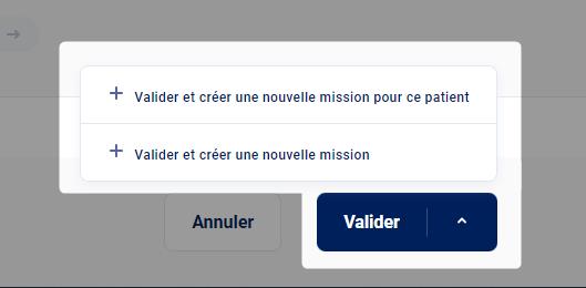 Valider et créer une nouvelle mission pour ce patient— Ceci valide la mission et ouvre un nouveau formulaire de prise de rendez‑vous, prérempli avec les données du patient saisies dans le formulaire précédent.Valider et créer une nouvelle mission— Ceci valide la mission et ouvre un nouveau formulaire de prise de rendez‑vous vierge, prêt à être rempli.