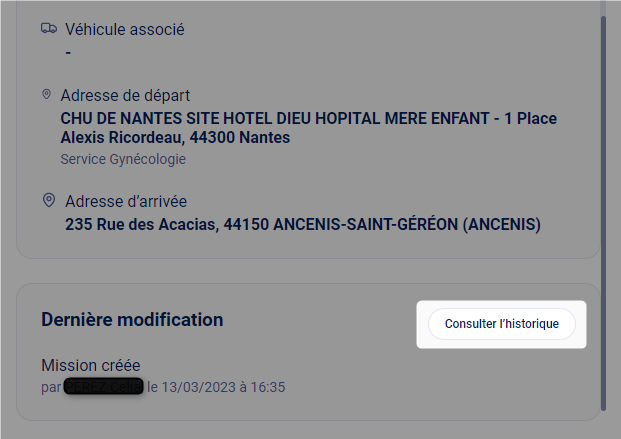 Le bouton "Consulter l'historique" permet d'accéder à la liste des modifications de la mission depuis sa création.