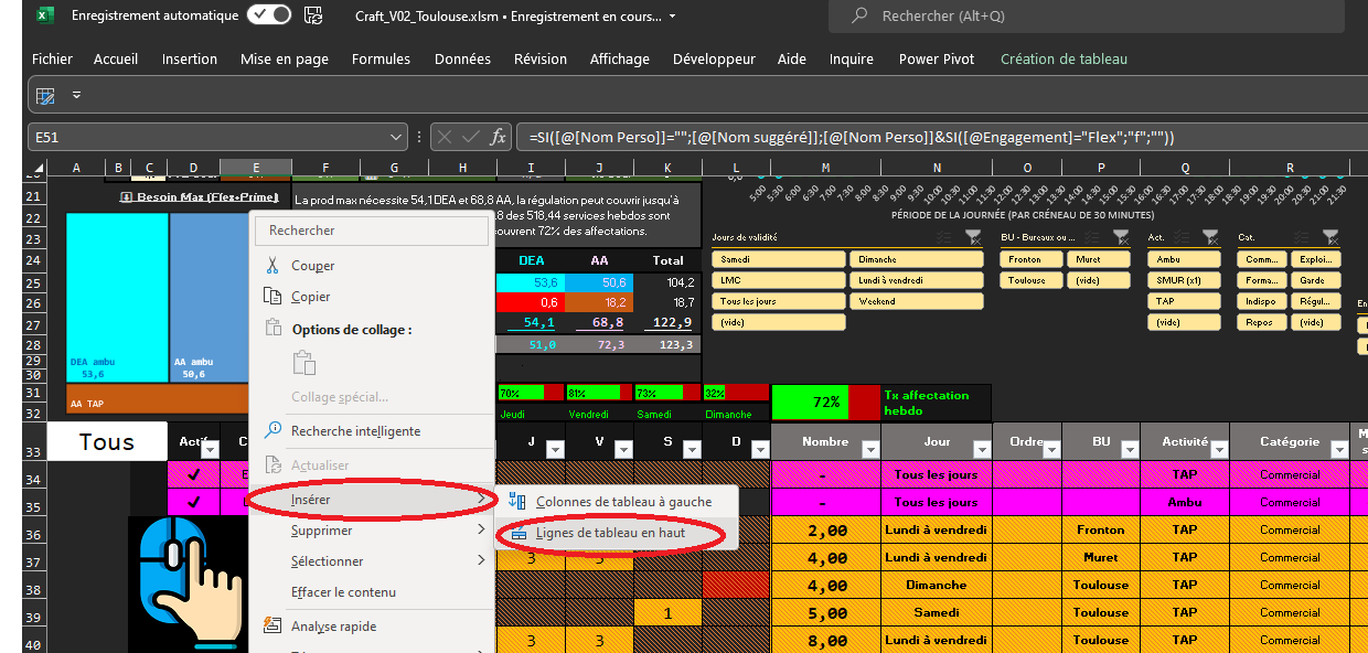 - Code : Identifiant du type horaire utilisé dans le canevas (04.Planning), est normalement calculé à partir des caractéristiques des services de production grace à une formule, mais peut très bien être "forcé" à l main