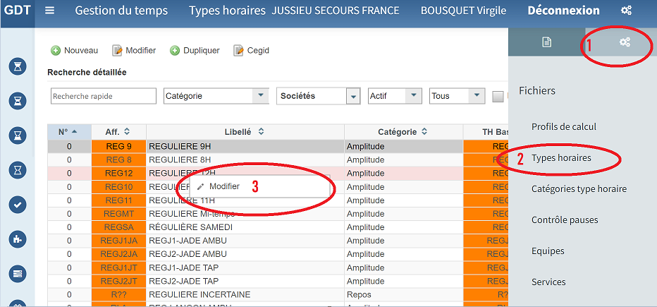 Ce code "caché" ne correspond pas aux codes d'affichages du type horaire dans la GDT, il s'agit d'un identifiant composé exclusivement de chiffre. Il est possible de consulter ces codes sans avoir accès aux bases de données ou aux datalake. Pour cela il faut vous rendre dans le menu type horaire de la GDT et ouvrir le type horaire que vous souhaitez afficher (clic droit modifier)