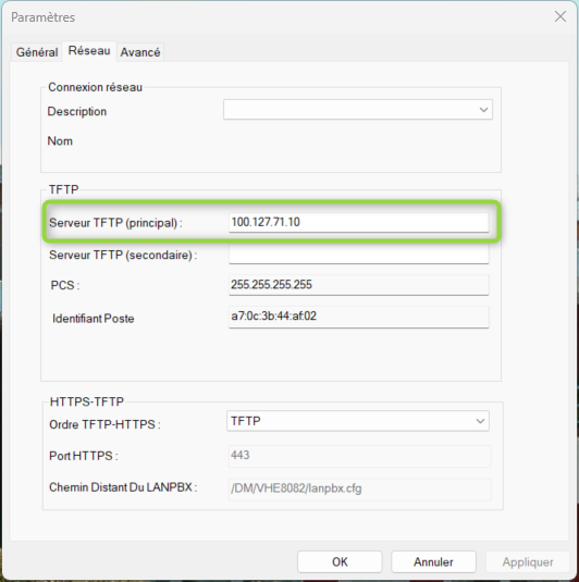 - Vous devez saisir l'IP du serveur TFTP (principal) : 100.127.71.10