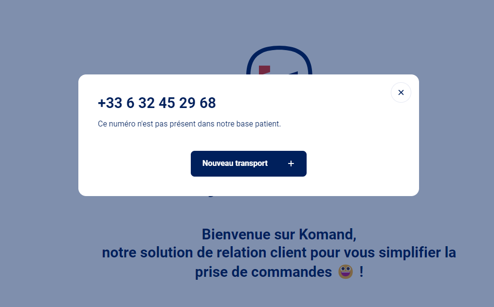 - Lors de la réception d'un appel via Kiamo, une pop-up s'affiche automatiquement sur la page d’accueil de Komand.