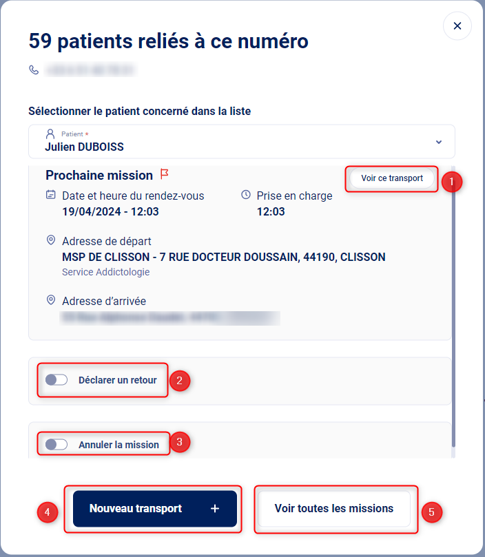 Annuler la missionest également disponible dans la pop-up, pour annuler la mission. - Il est également possible de créer une nouvelle mission pour ce patient en cliquant sur